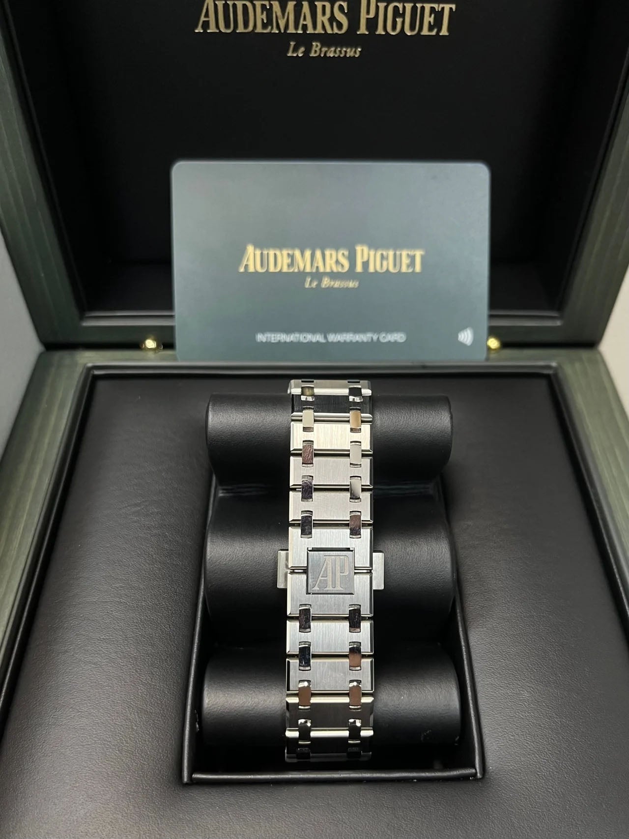 The Audemars Piguet Royal Oak Jumbo Extra-Thin in burgundy is a masterful display of contemporary watchmaking, blending advanced materials with timeless design. Its sophisticated smoked burgundy dial immediately draws attention, creating a striking contrast with the ultra-light titanium case. The use of bulk metallic glass (BMG) for the bezel and bracelet links not only enhances durability but also imparts a unique, modern sheen that sets this model apart. Glareproofed sapphire crystal on both the front and caseback ensures unobstructed views of the intricate movement while also providing robust protection. Pink gold applied hour markers and luminescent Royal Oak hands offer superior legibility against the rich dial, adding a touch of elegance. The integrated titanium bracelet, featuring BMG links and secured with an AP folding clasp, delivers both comfort and a secure fit. This extra-thin timepiece exemplifies Audemars Piguet’s commitment to refined craftsmanship, innovative materials, and sleek, sophisticated aesthetics
