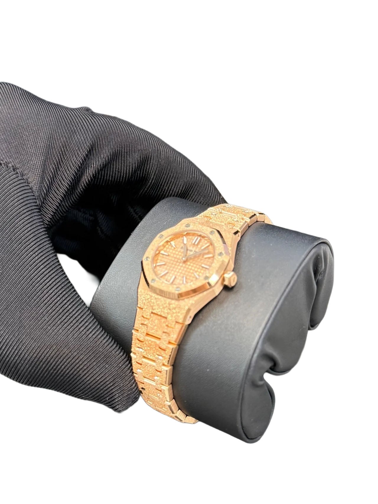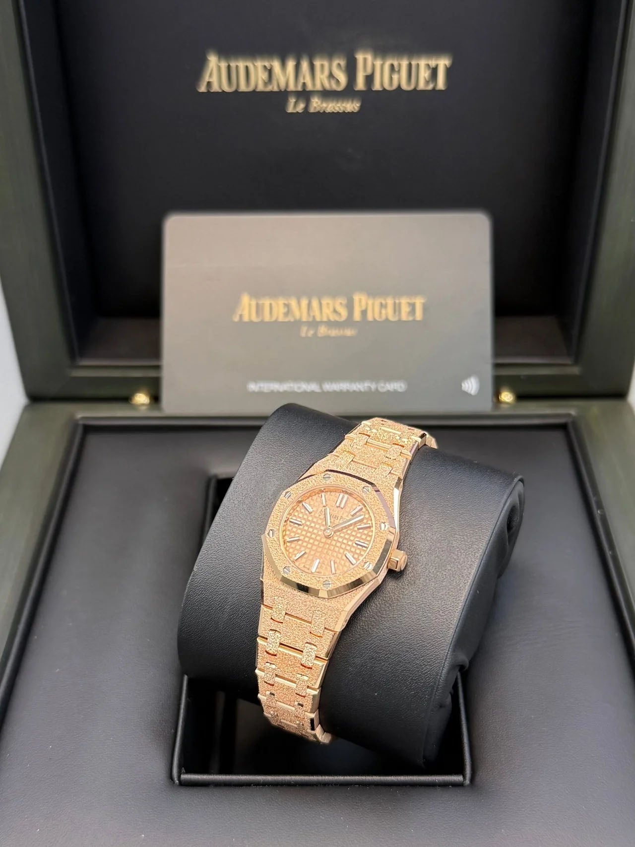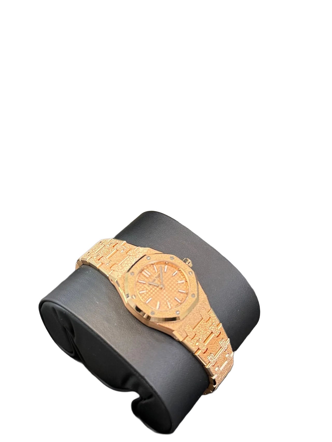 This elegant timepiece, crafted in 2024, features a refined 23mm case made of 18-carat pink gold, exemplifying both luxury and sophistication. The pink gold-toned dial is beautifully adorned with the famed “Petite Tapisserie” pattern, a hallmark of Audemars Piguet’s meticulous artistry. Accentuating the sumptuous dial are pink gold applied hour-markers and Royal Oak hands, both treated with a luminescent coating to ensure excellent readability in all lighting conditions.