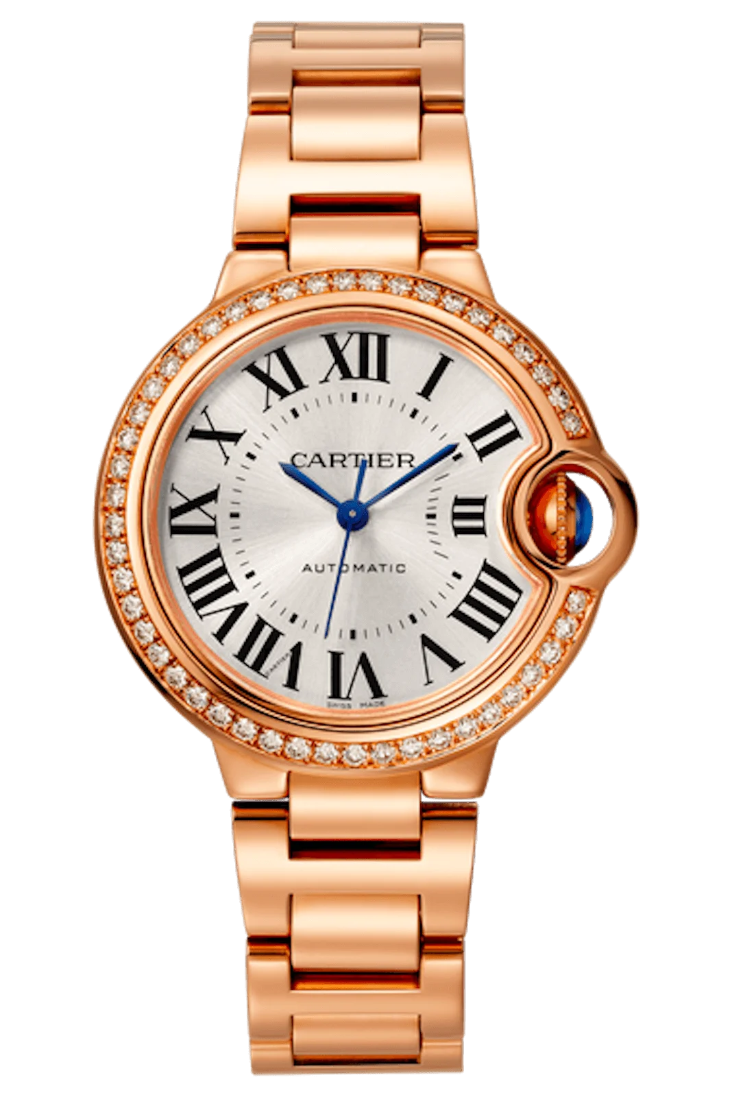 Ballon The 33 mm Bleu de Cartier watch has an automatic winding mechanism. 750/1000 rose gold case set with 47 0.68 carat brilliant-cut diamonds. set with a cabochon sapphire on a fluted crown. Sunray-effect silver dial. Sword-shaped, blued-steel hands. sapphire crystal. Bracelet in rose gold, 750/1000 interchangeable. It is 10.16 mm thick. Up to 3 bar (roughly 30 meters/100 feet) of water resistance.